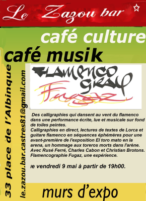 Au programme de cette amicale rencontre : calligraphie en direct, lecture de textes de Lorca et guitare flamenco en séquences éphémères pour cette avant-première de l'exposition « El toro mato en la arena » un hommage aux toreros morts dans l'arène.